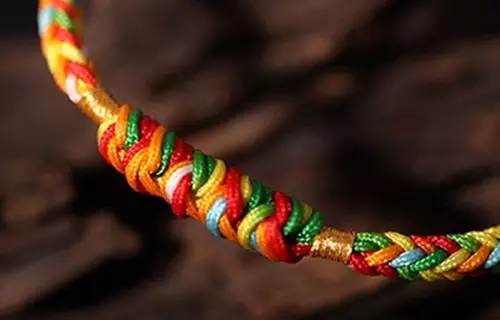 簡(jiǎn)單的以五色絲線(xiàn)合股成繩,系于臂膀;在五彩繩上綴飾金錫飾物,掛于項頸;五彩繩折成方勝,飾于胸前;五彩繩結為人像戴之;以五彩絲線(xiàn)繡繪日月星辰烏獸等物,敬獻尊長(cháng)。此俗始于漢代。